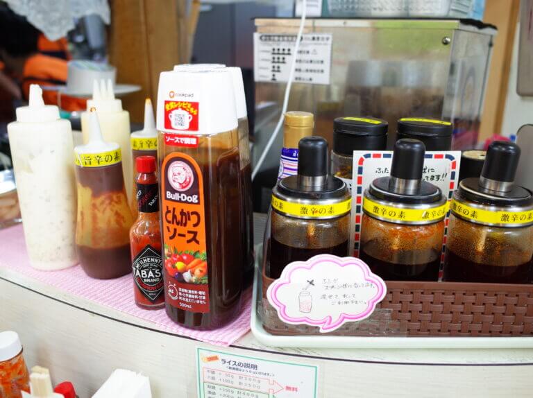 こんなにたくさんあるの珍しくないですか?激辛の素、ふりかけ2種、醤油2種、とんかつソース、旨辛の素、デスソース、スコーピオンソース。タルタルソースまであります。ほかにもあるんですが、もうきりがないっす。