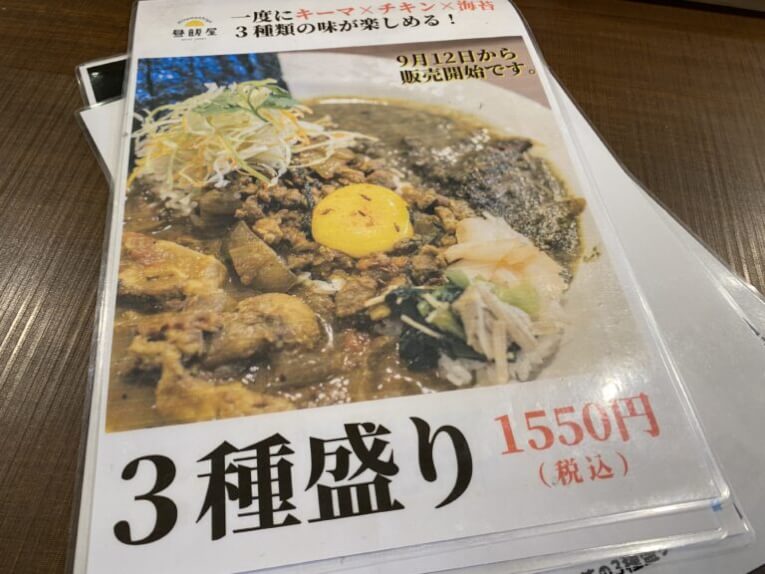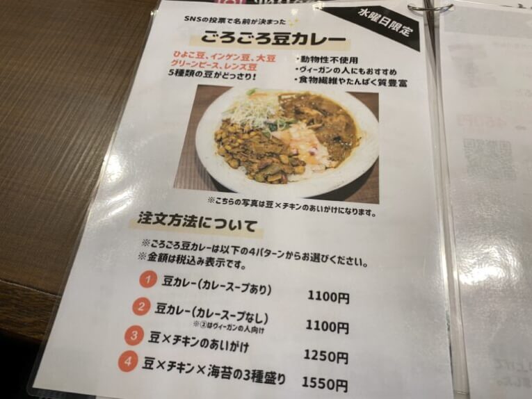 今日はラムキーマが売り切れてしまったということで、一通り食べることのできる「豆×チキン×海苔の3種盛り」をオーダーしました!