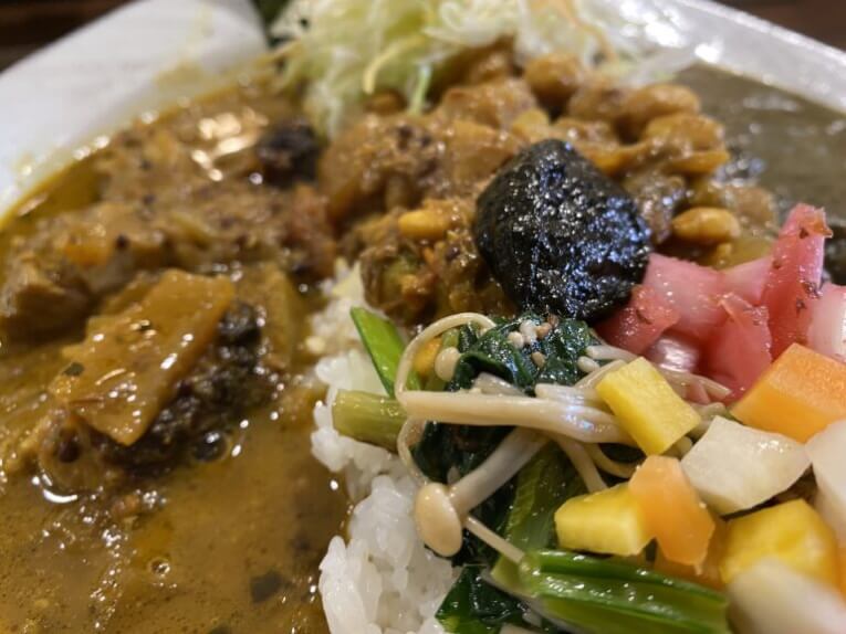 両脇に「ゴロっとチキンカレー」と「海苔チキンカレー」に囲まれる形で、真ん中には「ごろごろ豆カレー」がもられております。豆カレーの上に乗っているのは海苔の佃煮だそうです。佃煮の他にも焼海苔が添えられています。ラーメン以外いで、こんな盛り付け初めてみました。