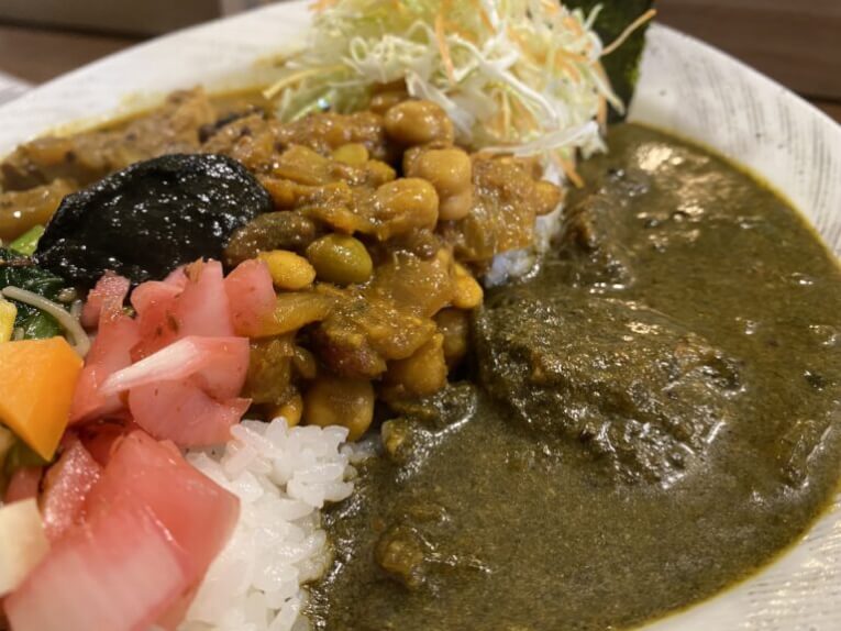 豆カレーはひよこ豆、インゲン豆、大豆、グリーンピース、レンズ豆の5種類をふんだんに使われていて、ほどよい固さの豆がとってもおいしかったです。豆カレーはご飯と一緒にというか、スープのように食べられる楽しさもありますよね。