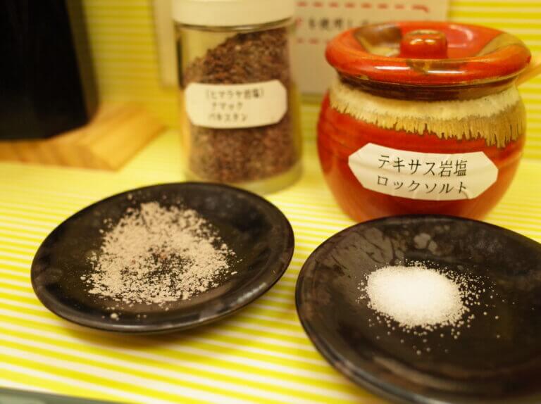 ヒマラヤ岩塩のナマックテキサス岩塩ロックソルトとあり、どちらも舐めてみたのですが、ロックソルトの方は旨味もありながらもガツンとしたインパクトのある塩で、ナマックの方は硫黄のにおいが強い香りと、独特のコクを味合う塩でした。周りの常連らしきお客さんたちはナマックを使っている人が多かったです!