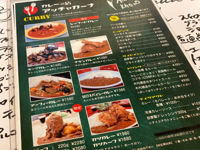 アッチャカーナとはヒンズー語で「美味しい食べ物」という意味で、チキンカレー、キーマ、アーフィーカレー、その他にも季節のおすすめカレーなど