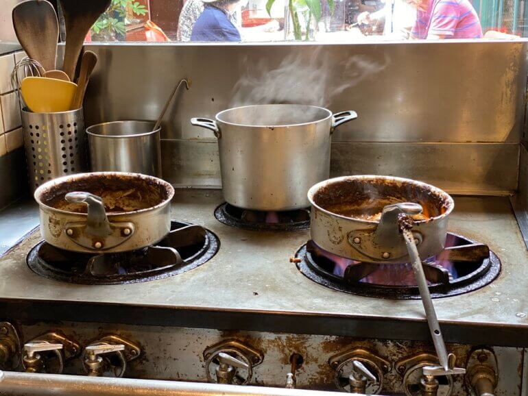 シェフはたんたんと作り置きされたカレーソースを鍋にとって、様々なメニューに合わせた具材を一緒に煮込みます。
