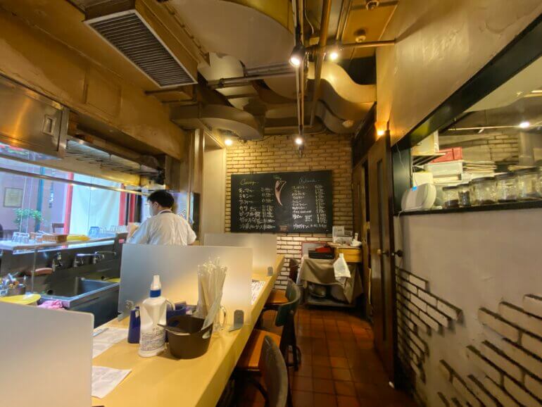 まるでパリの町並みのような素敵な空間になっていて、そこで食べることもできます。僕は今回1名だったのでカウンターに通されました。