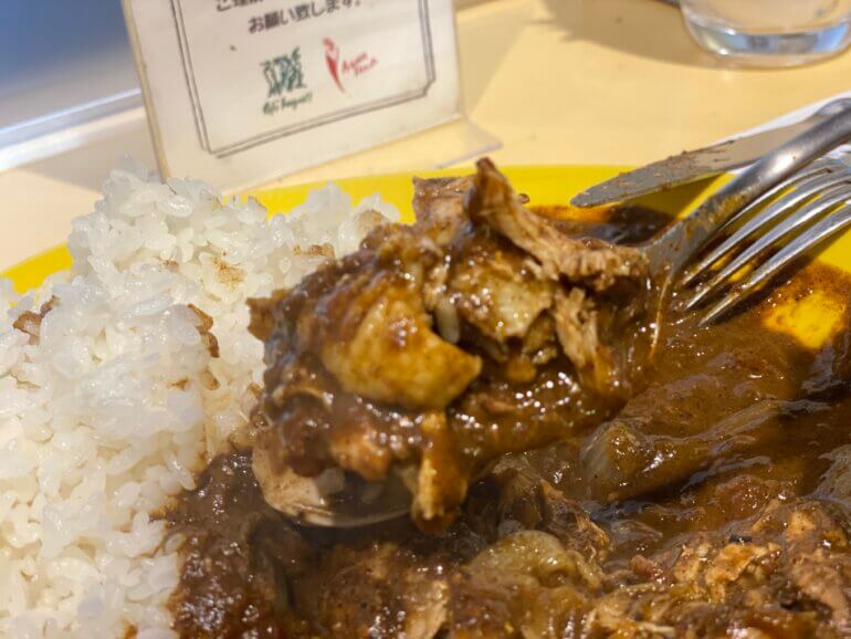 シーフードカレーや、カツカレー、ビーフと気になったのですが、お値段もするのでまずはチキンカレーをオーダーしました!黄色いきれいなお皿の上に盛られたチキンカレーは褐色が食欲をそそるおいしそうな欧風カレー、その上に大きなもも肉がまるまる乗っかっており用意されたフォークとナイフでほぐして食べます。カレーを食べるのにナイフを使う時ってあまりないですよね、銀座のナイルレストランぐらい!