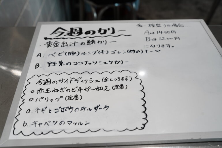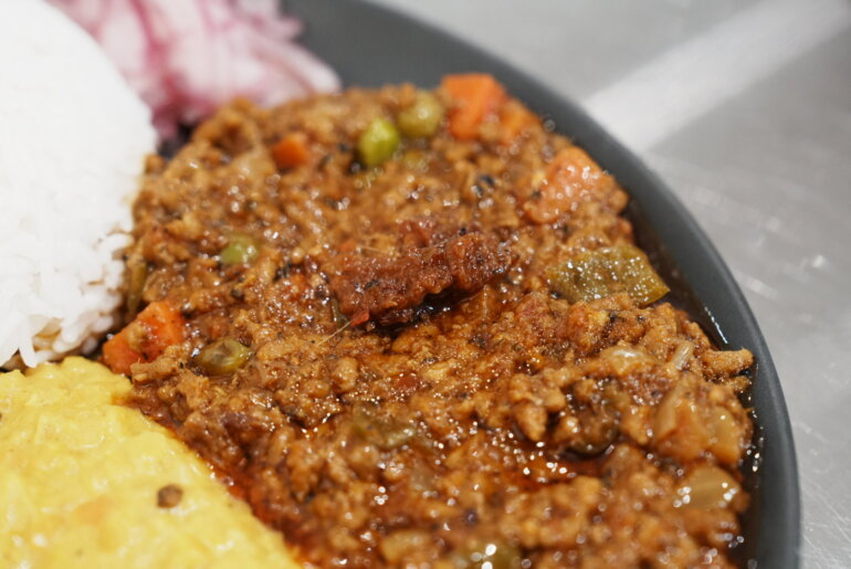 今週の週替りはバビルンブゴレンキーマで、ナシゴレン風かつスリランカ風な牛豚ひき肉を炒めたキーマカレーにアレンジしたそうです。飴色に輝く質感はカレーというよりも東南アジアの料理のようで、濃いめの味付けでご飯と合います。このライスもバスマティライスと日本米がブレンドされていて、乾いた質感としっとりとしていて、シャバシャバなソースにも、粘度高いものにも合いますね。