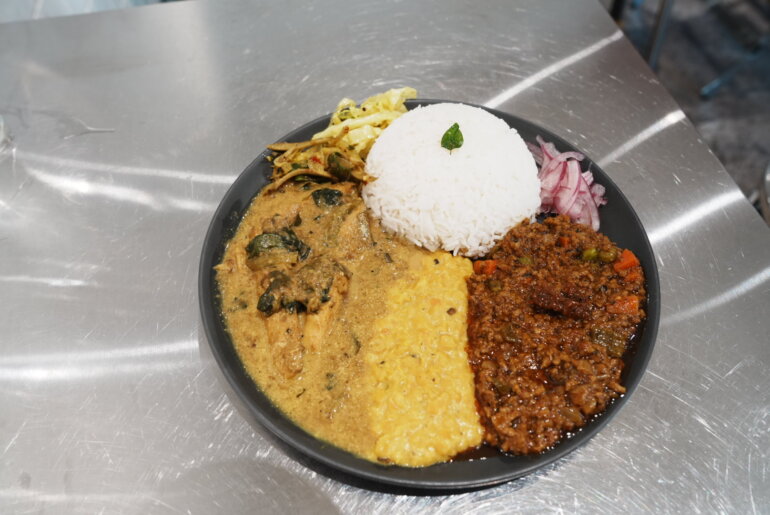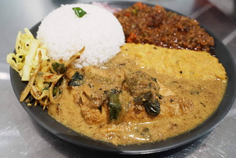 定番の副菜と合わせられた副菜もおいしくて、パリップも混ぜ合わせながらいただいて最後までおいしくいただけました。副菜の内容は赤玉ねぎのビネガー和え、バリップ、ネギとゴボウのテルダーラ、キャベツのマッルンでした。