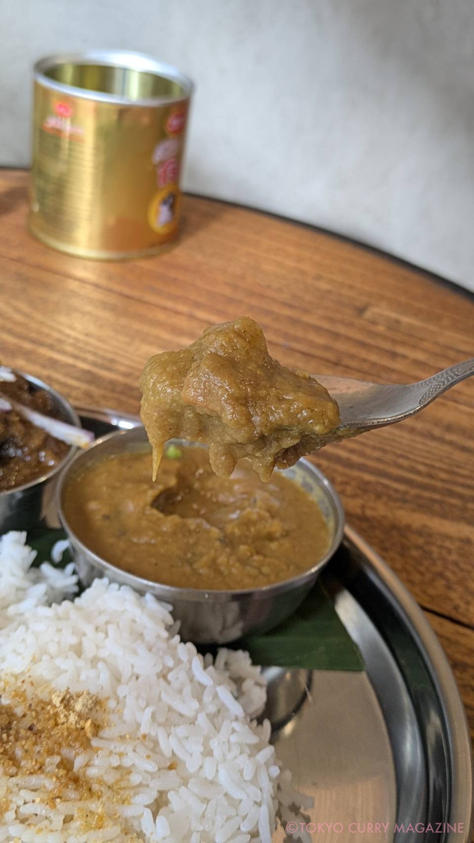 そしてサンバル。とろりとした口当たりに、茄子・大根・人参がやさしく広がります。ほんのり感じる酸味が全体をまとめてくれて、いい意味で抜けを作ってくれる存在に。