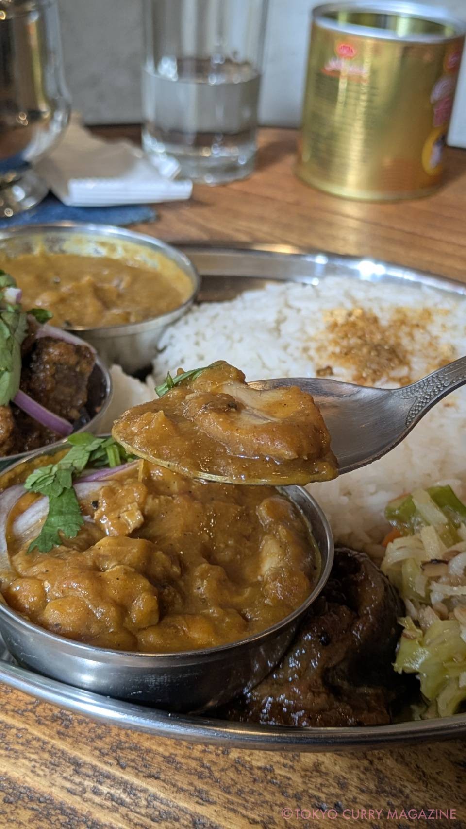 まず印象的だったのは、チキンダルチャ。柔らかく煮込まれたチキンの旨味が、お豆にじんわり溶け込み、どこまでも優しいカレーでした。