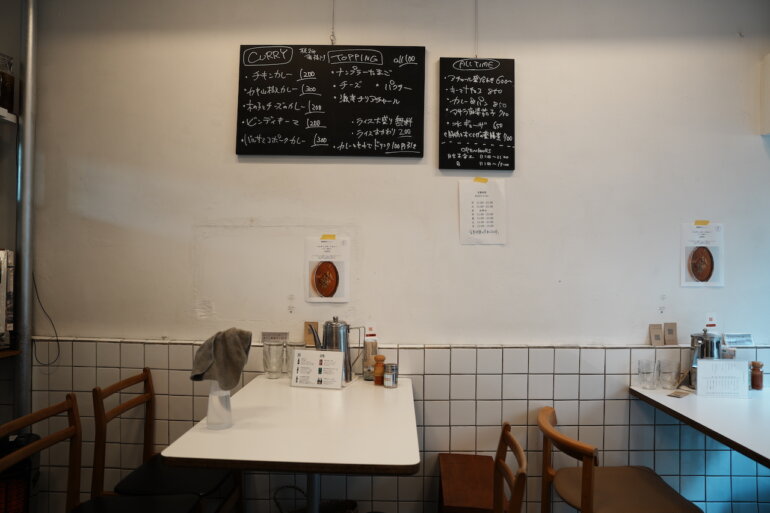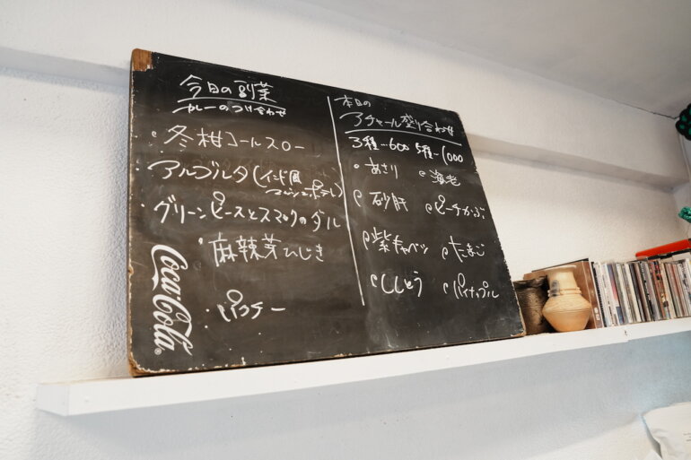 チキンカレー、カキ山椒カレー、木の子とチーズのカレー、ビンディキーマ、バルサミコポークカレーと5種類ものカレーが並ぶ中、カキには目がない性分なので、カキ山椒カレーをオーダーした。今日の副菜と書かれた看板には冬柑コールスロー、アルブルタ、グリーンピースのダル、麻辣芽ひじきと出てくるまで想像がつかないような内容で楽しみ。