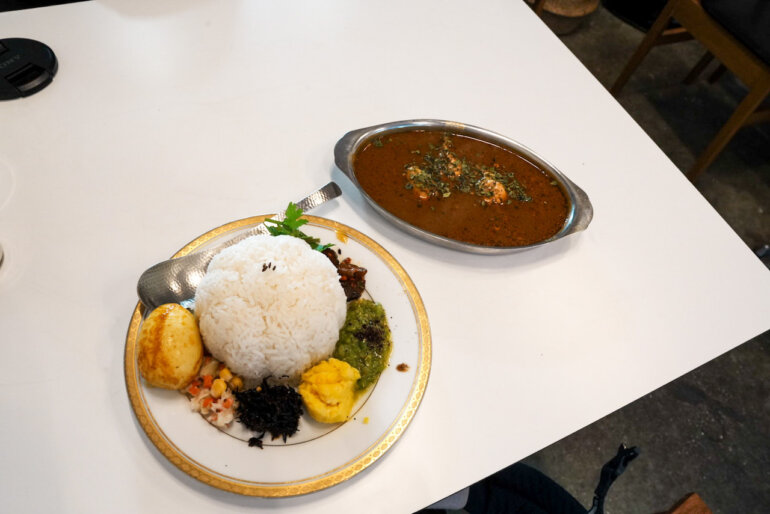 n金の縁が美しい白いお皿を彩るように副菜に囲まれたライスがとてもかわいい。ライスはよくみると日本米とジャスミンライスがブレンドされていて、パサパサとしたジャスミン米が少しもちっとした食感になる。これだけで日本人に合う米に変わってしまうのでおもしろい。