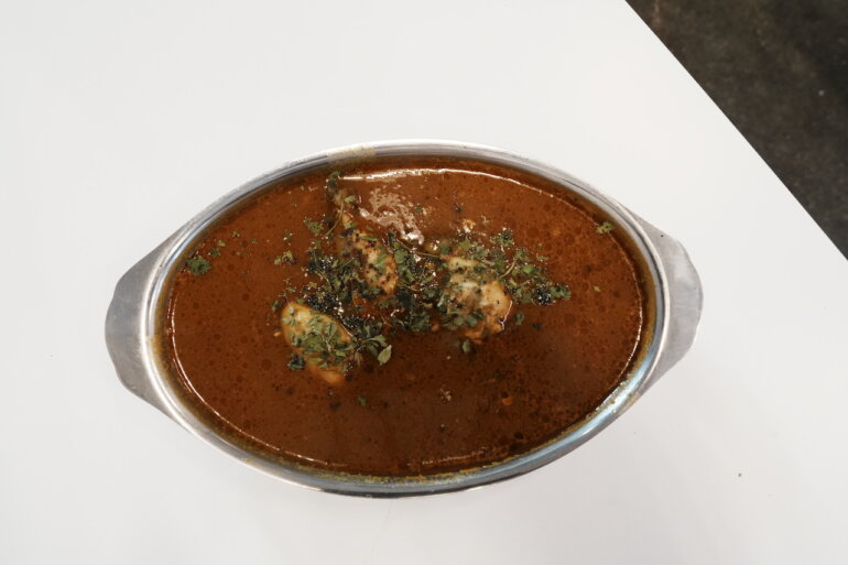 シルバーの器をたっぷりと満たすグレービーにカスリミティが浮かんでいる。一口含んでみると山椒の香りが鼻を抜けつつ、舌ではコクのあるスパイシーさと、カキの出汁が合わさる。スープのように飲んでいたくなってしまう。