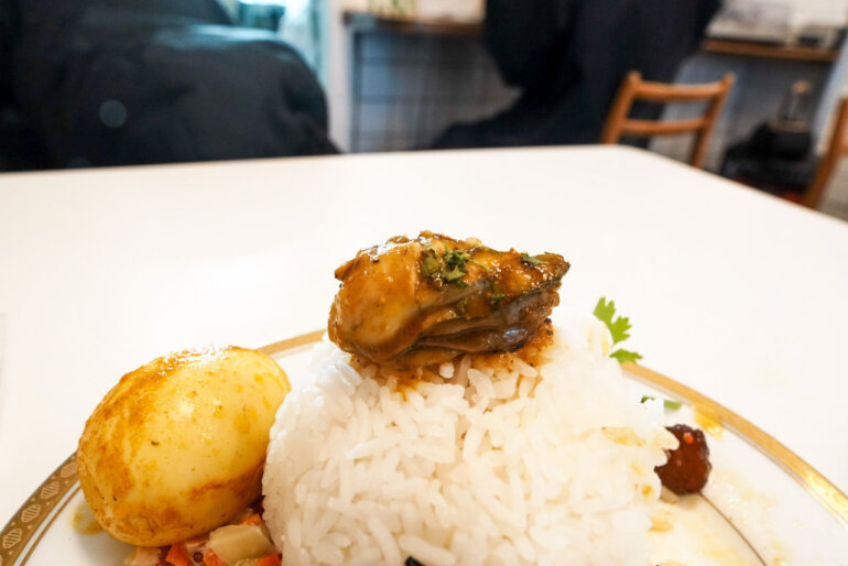 グレービーの中には大きなふっくらとしたカキが3粒も。このカキはしっとりふっくらとしていて、艷やかにうまい。カキにはこれを求めたい。