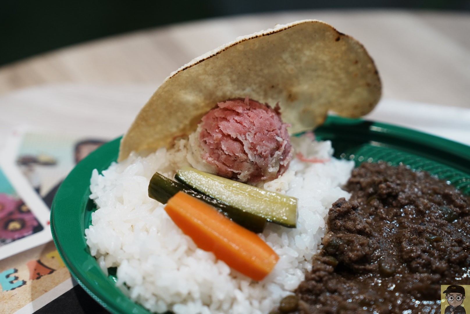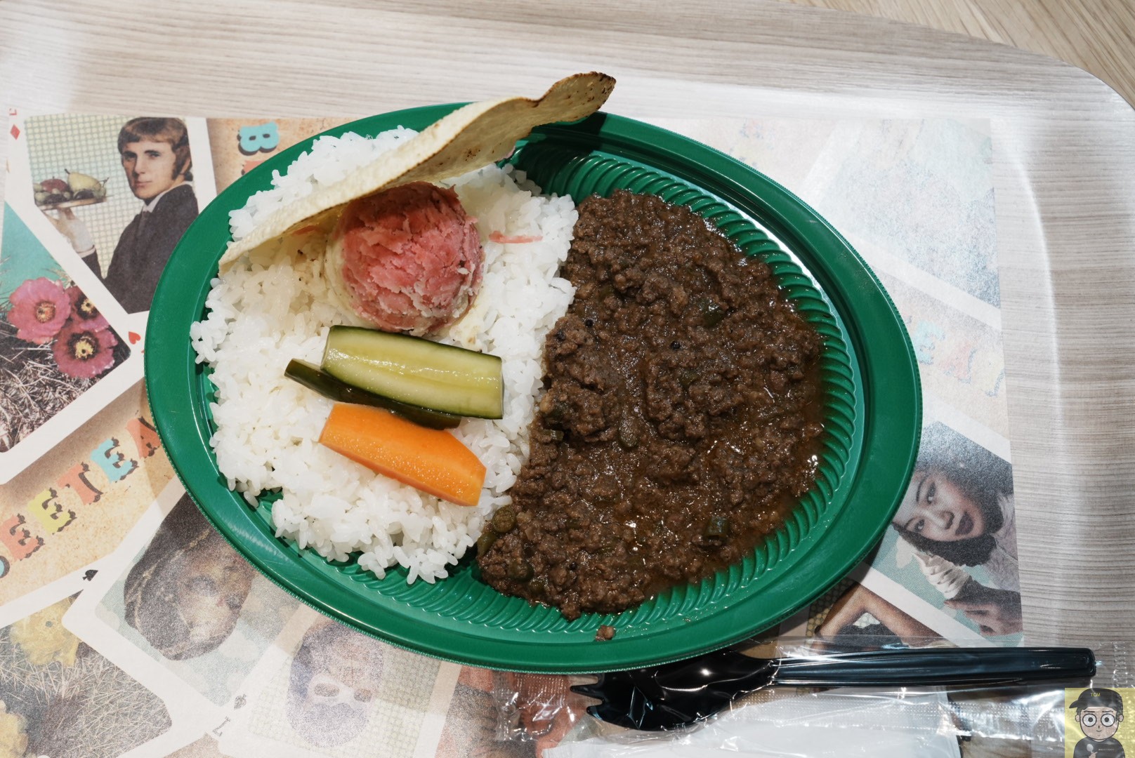 The curry is served in a green plastic bowl, generously filled with keema curry, rice, pickled carrots and cucumbers, mashed potatoes shaped like sorbet, and a piece of papadum.