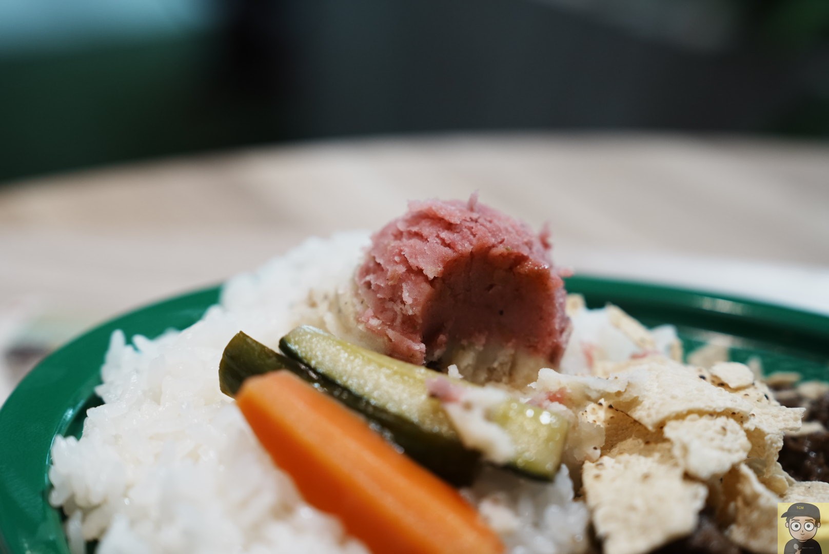 As expected in a food court, the meal is served in a disposable plastic container. However, the green color and detailed design make it feel quite stylish and practical.