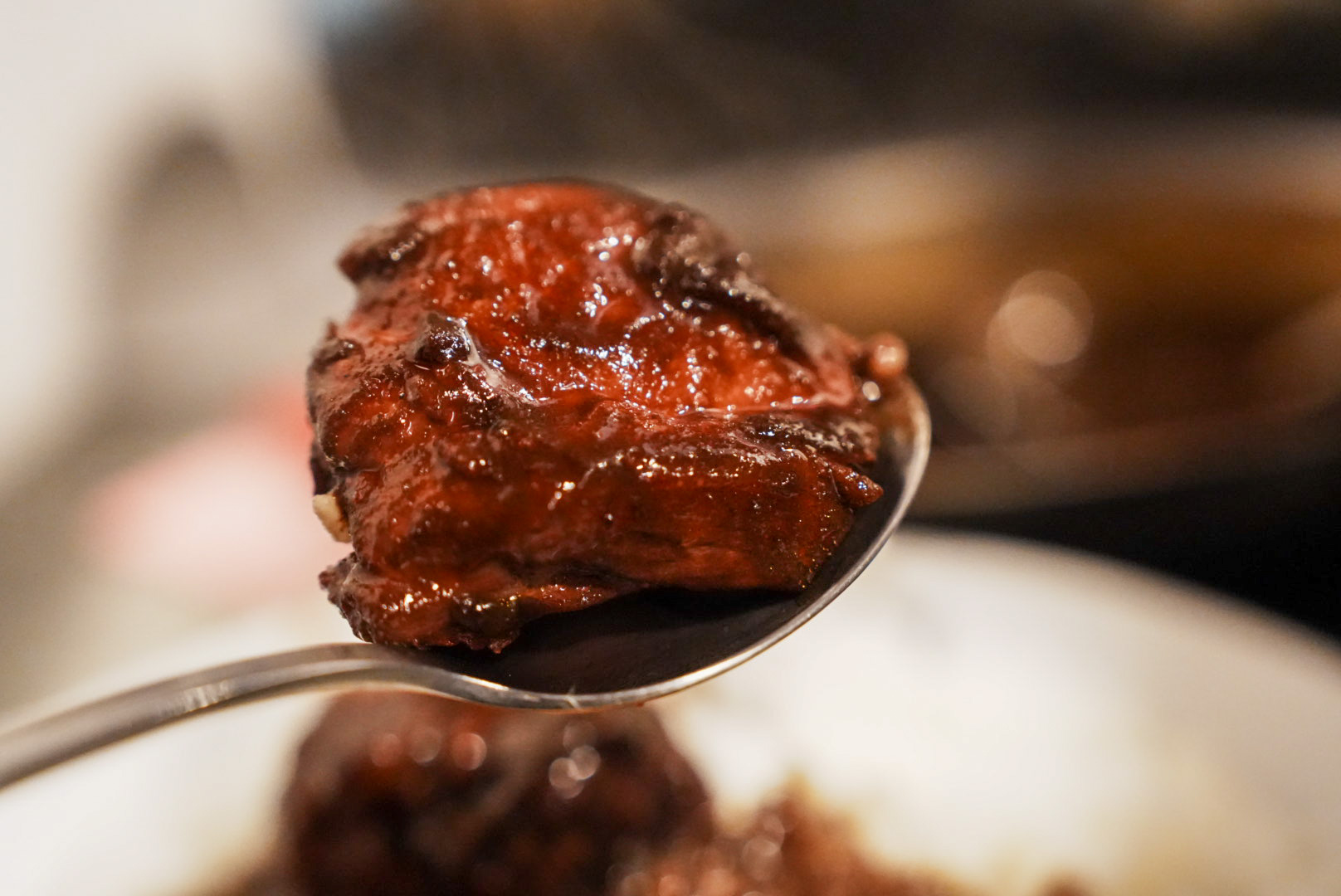 カシミールをライスの上にかけていきながら、大きな鶏肉をすくいます