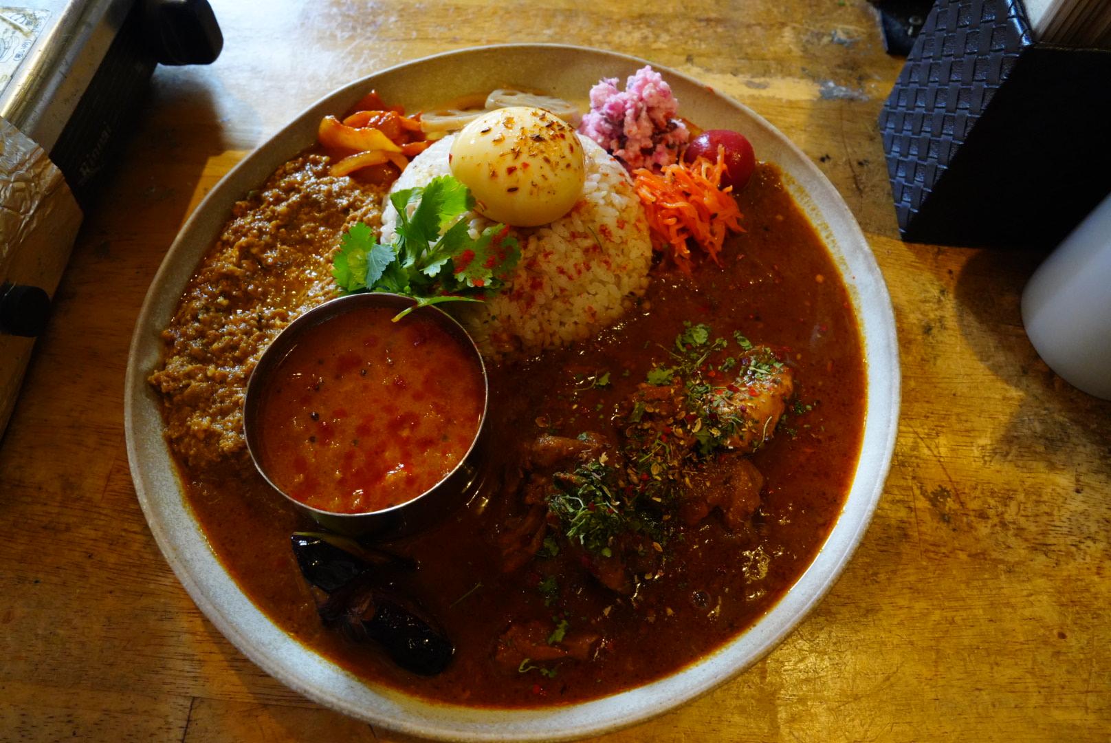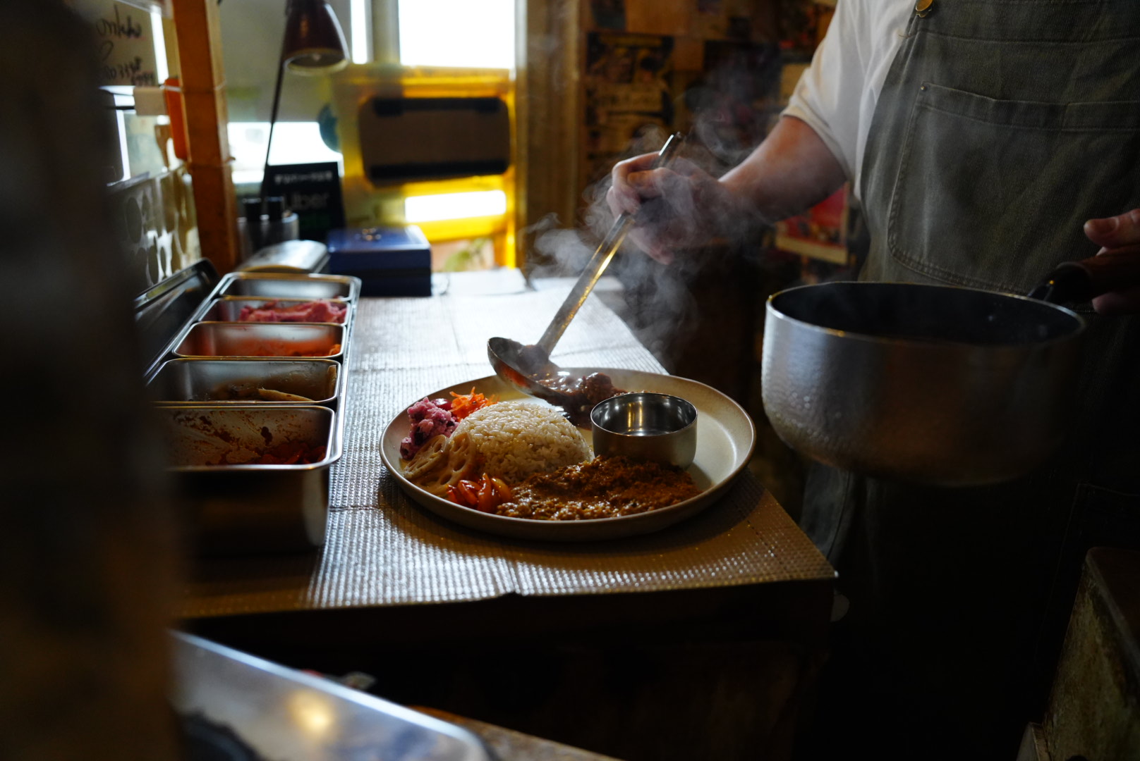 Instagramでずっと気になっていたキャッチーな店名を持つお店は、代官山のたこ焼き屋「天風」を間借りして営業をしています。カレーの調理場はたこ焼き鉄板の上にあり、店内に入ると業界人の名刺が飾られた壁と、たこ焼きの匂いが食欲をそそります。店主はカウンターの中で忙しそうに働いていましたが、親しみやすいトーンで迎え入れてくれました。