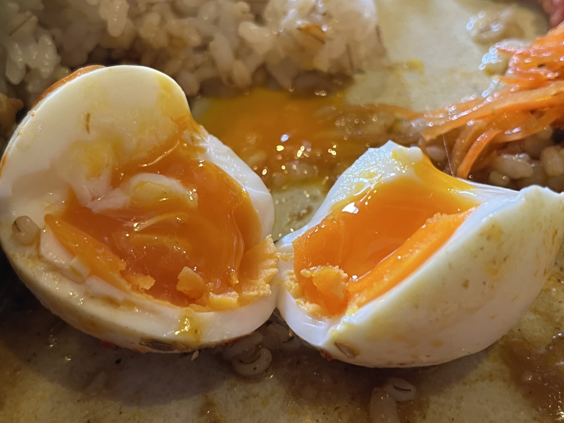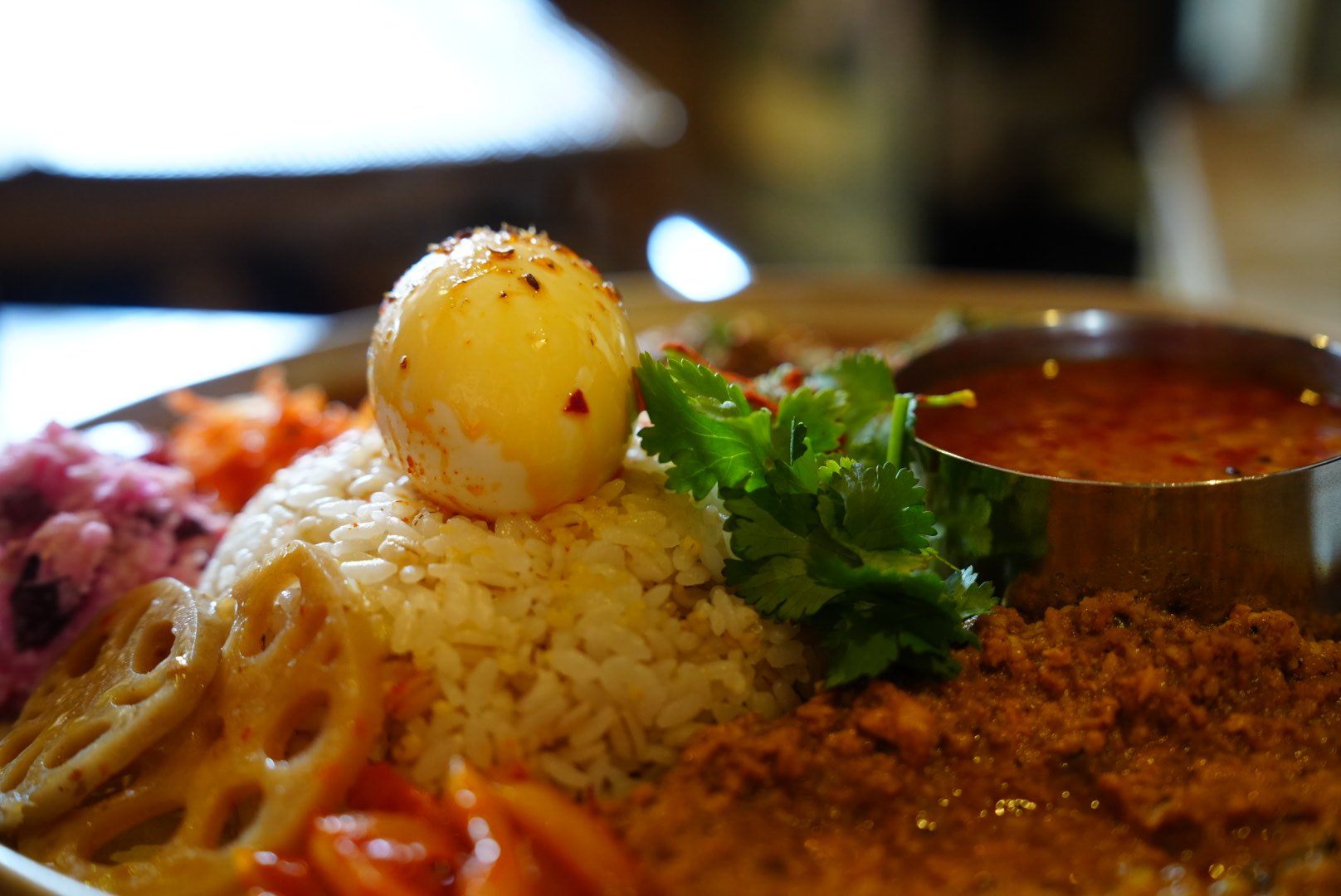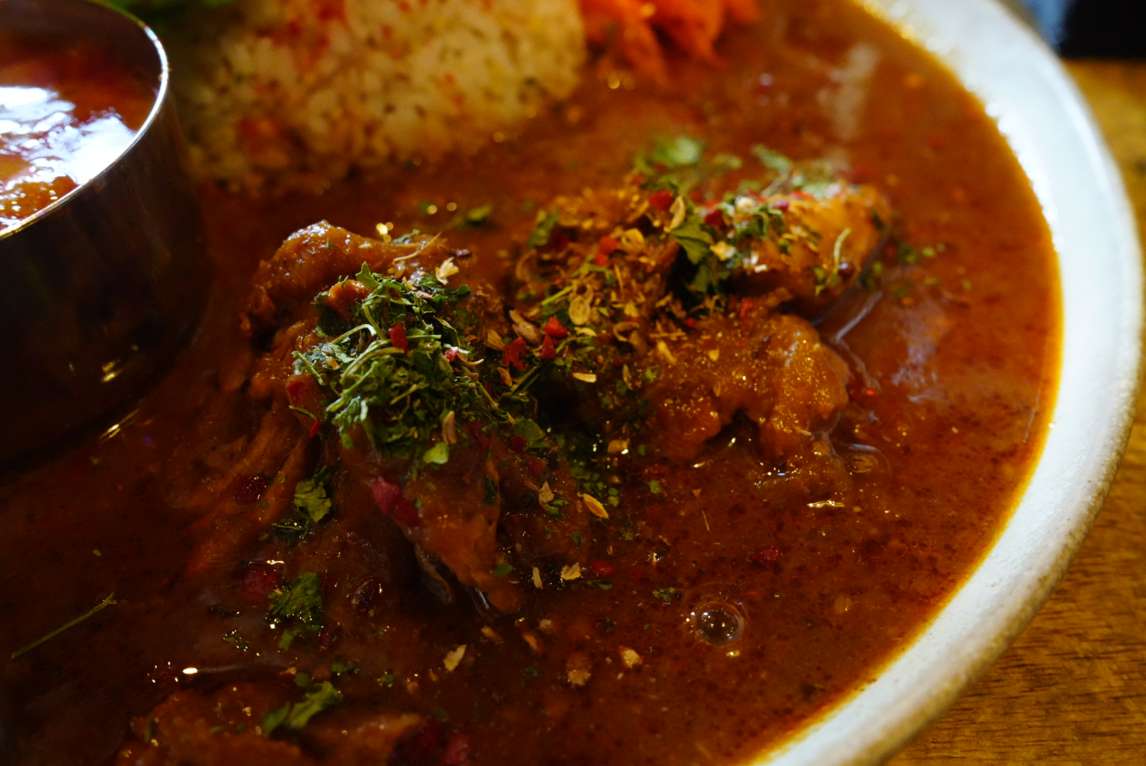 丸麦の食感とご飯がおいしくて、店主に聞いてみたところ、お米屋さんにカレーに合うものを何度も相談して見つけて契約したのが新潟のつぶはり米「新潟こしいぶき」だったそうです。弾力のある粒だった米はしっかりした歯ごたえが特徴。そこに丸麦を加えることで緩急のある触感が楽しく美味しいご飯でした。