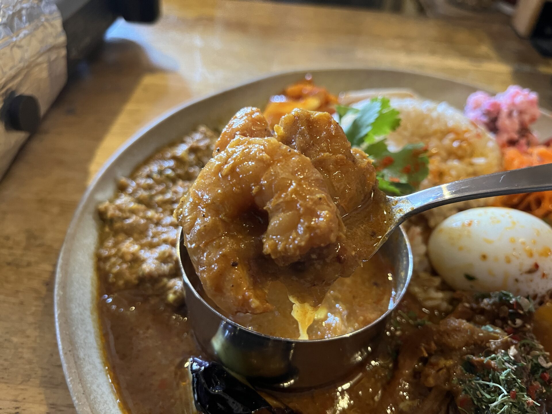 別の器に盛られたエビカレー、これは確かに別にわけるべき!なぜなら口にいれてみると芳醇(ほうじゅん)すぎる海老の香り、まるで海老のビスクのスープを食べているかのよう。このままスプーンでソースだけ食べきってしまいそうでした。