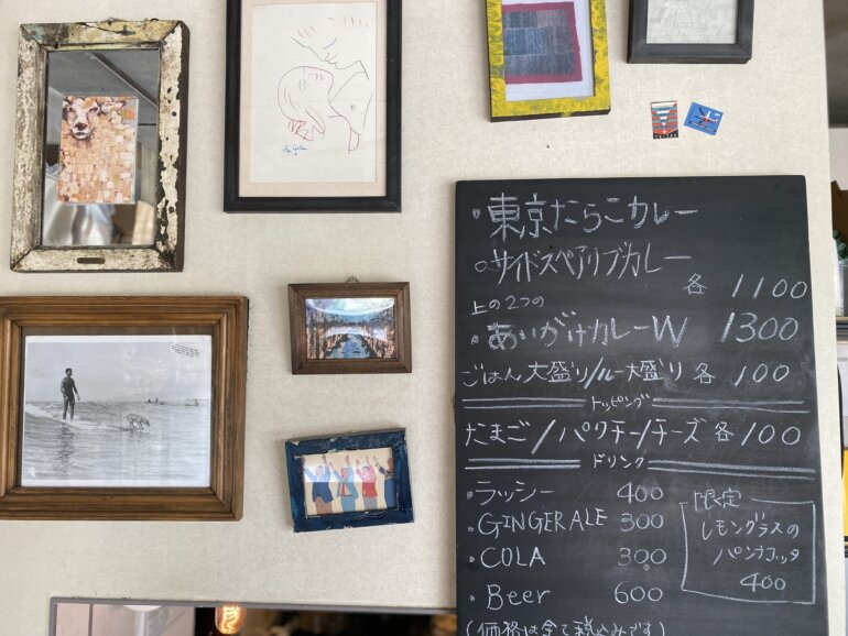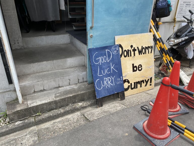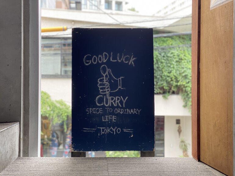渋谷区恵比寿駅から徒歩8分、渋谷方面にJRの線路に沿うように歩いて、交差点を右に曲がったところに青い大きなドアのお店がある。グッドラック!と親指を立てたイラストのおこにはDon’t worry be Curry!と書いてある看板もあります。それだけ主張しつつも、カレー屋です。と小さな説明も書いてありました(笑)一見雑居ビルなので、うっかり前を通り過ぎてしまいそうになるので大きな青いドアと、この看板を目印にしてください。現在は竹芝と渋谷PARCO(パルコ)の中にも出店中です。