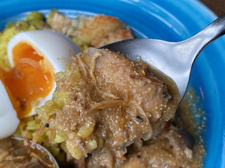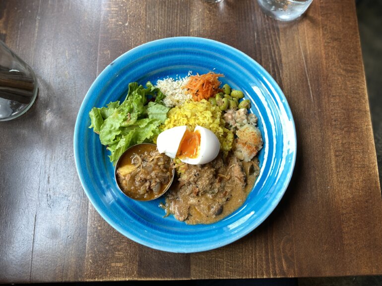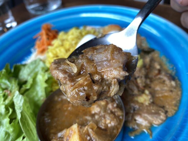 東京たらこカレーはぷちぷちとたらこの粒を感じながらも、出汁の効いたカレーの角をとったまろやかにしていました。サイドスペアリブカレーも欧風なエッジの効いたカレーかと思っていたのですが、脂の乗ったスペアリブはまるで牛すじのようで、旨味がガツンとくるようなカレーでした。どちらもおいしくて、全体を混ぜ合わせてスリランカスタイルで食べても違和感なく美味でした!