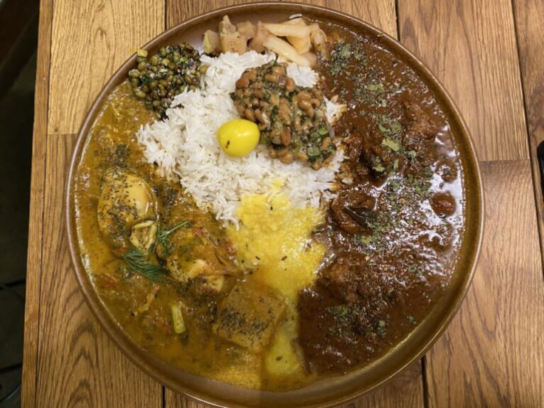 思わず歓声をあげたくなるほどの美しい盛り付けはずっと憧れていたスパイスカレーでした。絵の具が混ざり合って新しい色ができあがるような印象です。