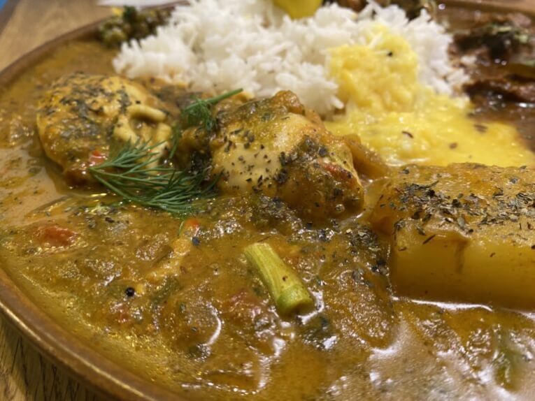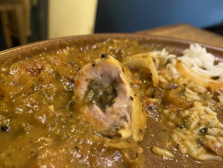 コリアンダーチキンカレーはスパイスの苦味を感じるほど濃厚なのに、後味が爽やかな旨味で、他のソースなどと混ぜ合わせながら食べると美味しかったです。