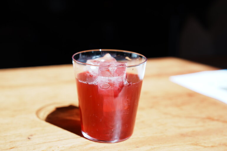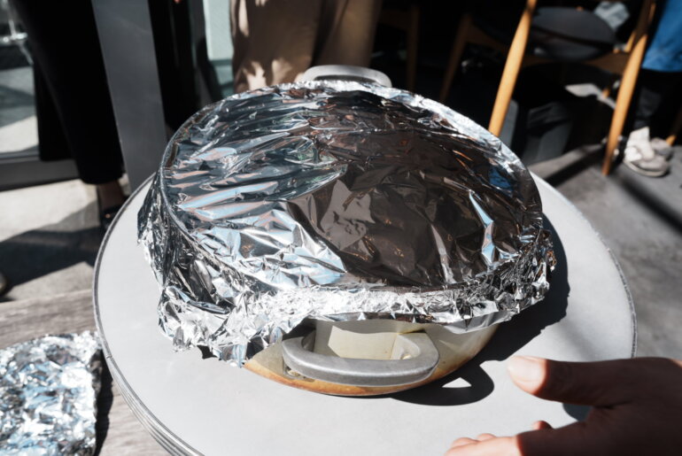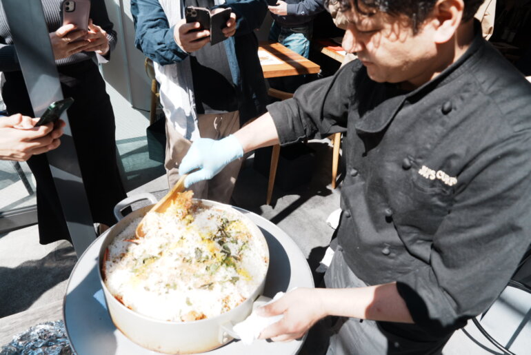 ジョギさんが大きな鍋を持ってカウンターから出てきました。お店のテラスに置かれた大きな鍋を囲むようにお客さんが集まりスマホを手にする。いよいよだ。