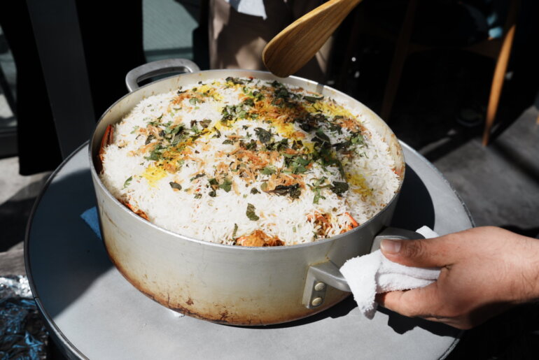 鍋をおおっていたアルミホイルが外れると「おぉ!」っと歓声があがる。それもそのはず、こんなに大きな鍋をビリヤニが満たしている。これはあがる!