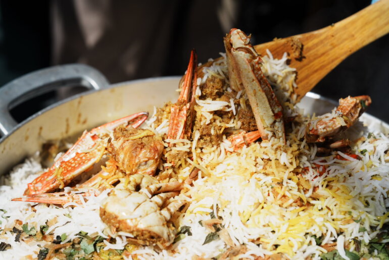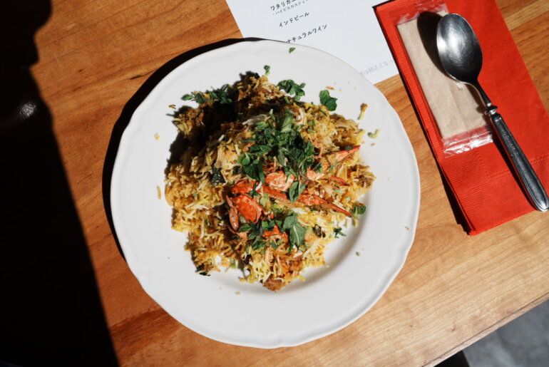 スパイスで色づいた白と褐色のバスマティライスだけでも色鮮やかなのに真っ赤に蒸されたワタリガニの彩りは美しい。まずここにビリヤニの魅力はひとつあるよな。と思う。パクチーとミントの葉もコントラストを強める。