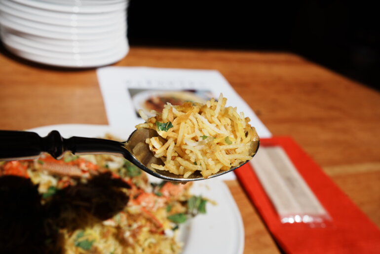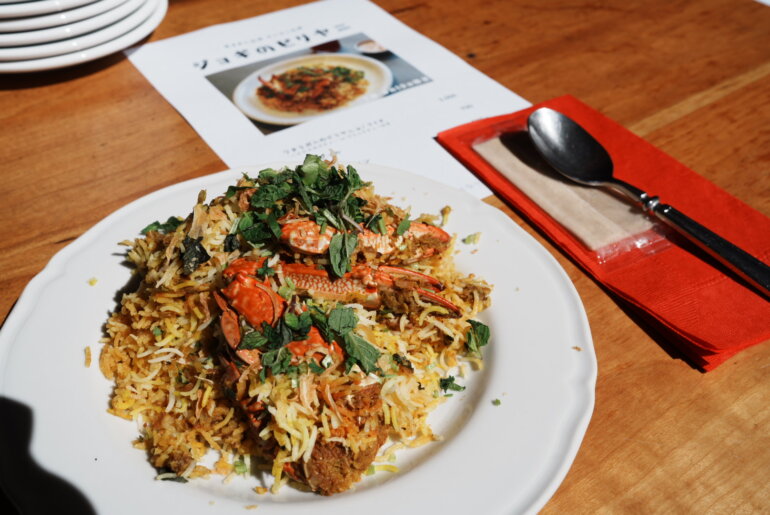 大量に調理されているのにライスは見事にふっくらと軽く炊かれていて、ジョギさんの腕が光る。まずはそのまま口に運んでみると、口の中に一番に拡がるのはワタリガニの旨みと香り、そして追いかけるようにスパイシーな香りが鼻を抜けていく。「めちゃめちゃうまい!」なんかの漫画だったらパン!っと思わず柏手を打ってしまうだろう。さらにワタリガニの味噌がごろっと入った部分が口に入る。もうこれはたまらない美味しさで、ビリヤニのボーナスタイムに入った。この余韻が残っているうちにあっという間に平らげてしまった。