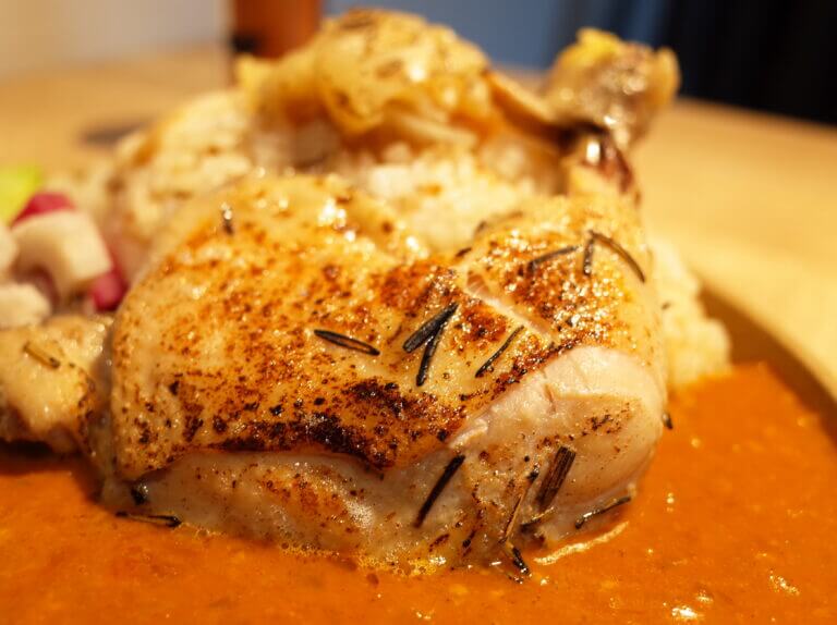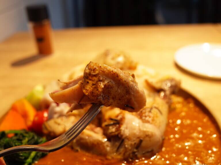 スパイスカレーはとってもまろやかな口当たりで、バターチキンのような味わい。だけど辛味もじんわり、そしてだんだんと輪郭を表すようにはっきりとしてきます。このカレーだけでもおいしいのですが、さきほどの玉葱とバターで炊き上げられたご飯と一緒に食べると、もう舌を甘やかしすぎるほどでした。