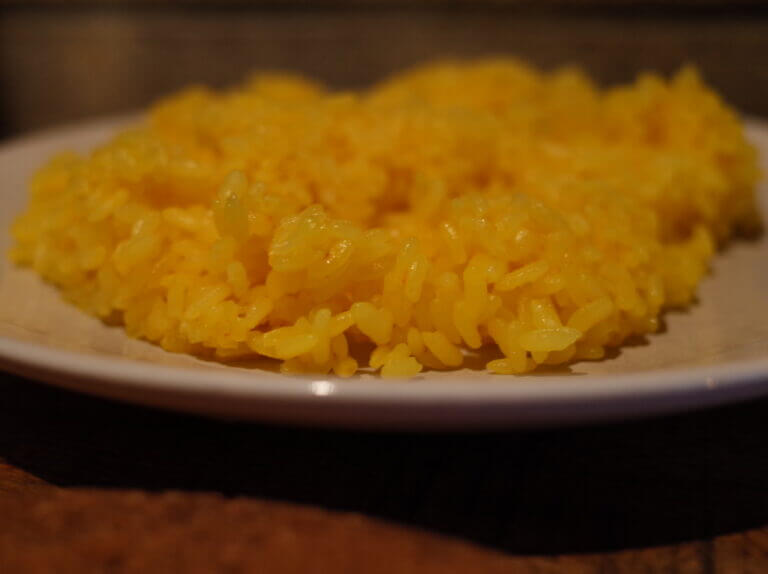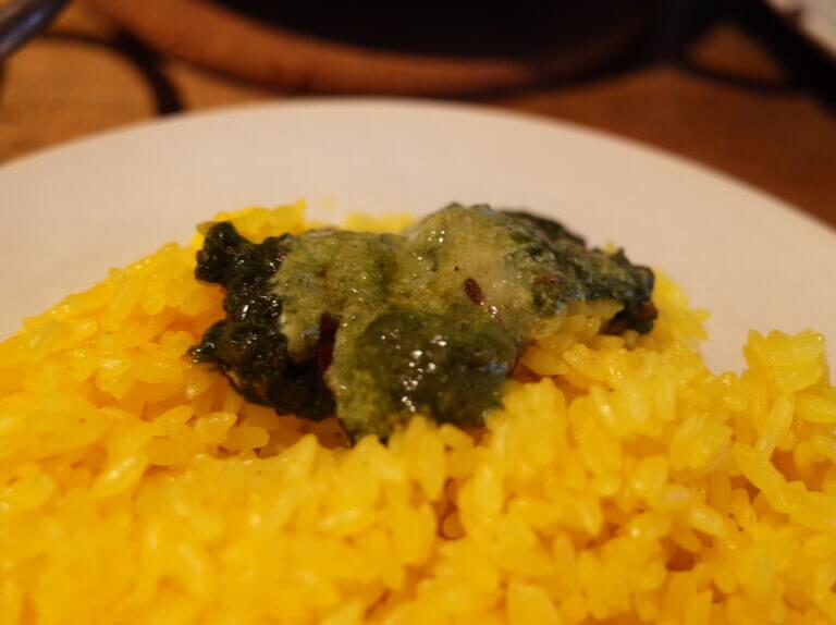 最初にご飯が運ばれてくるんですが、真っ黄色のサフランライスが2皿も運ばれてくるのは一人で入る焼き肉屋ぐらい気まずかったです。一皿にまとめようかと思ったんですが、鬼盛りのようなお皿もきまずいと思ったので潔く2皿を並べました。ヨゴロウのライスはも炊き加減も良く固めで、オイリーなヨゴロウのカレーとの相性はめちゃくちゃいいんです。