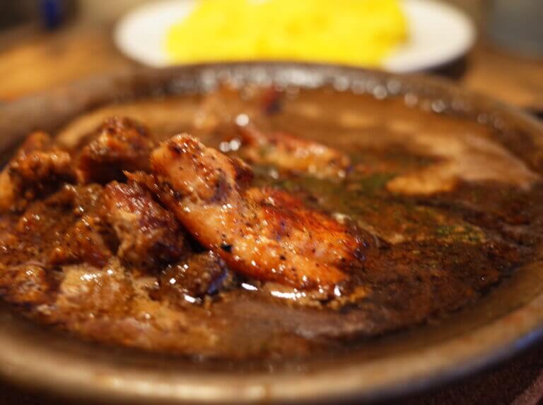 久しぶりのご対面!チキントマトカレー!これこれこれー!オイリーな見た目にごろっと入っているチキンが表面はバリっとしていて香ばしくて最高なんです。熱々の鉄皿はカレーが冷めにくくて2皿分食べる時にもいいですね(笑)