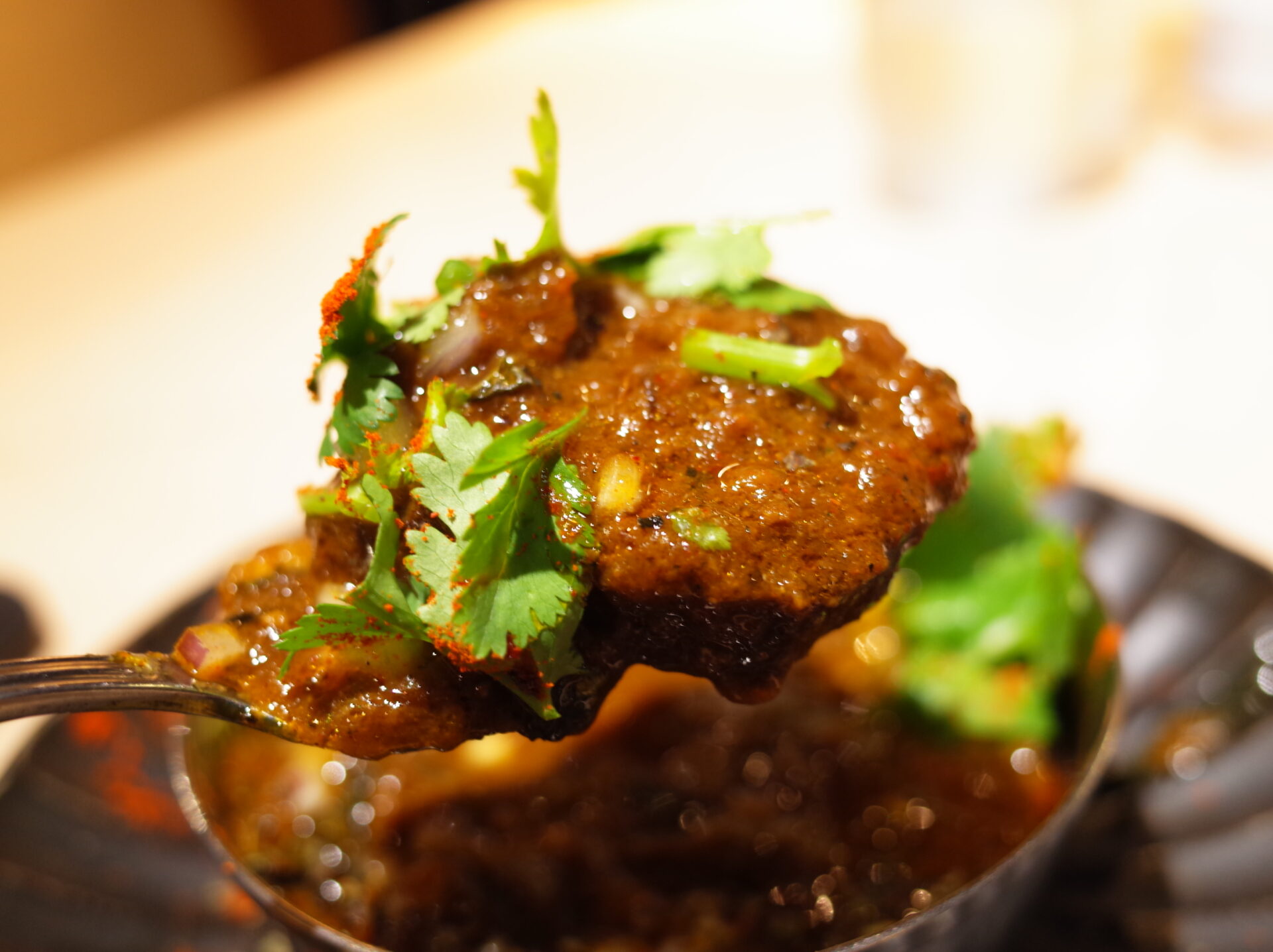 ホタルイカカレーは椎茸、昆布、かつお出汁がベースとなったグレイビーは見た目に反してとても和風なテイストで、ホタルイカだけではなく、はまぐりも入っていて海の旨みがとても濃厚に抽出されたカレー。