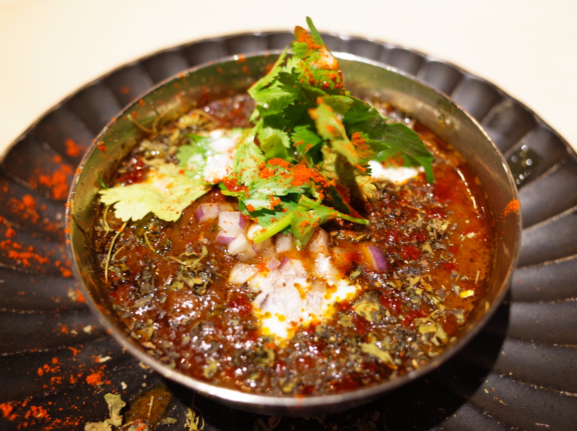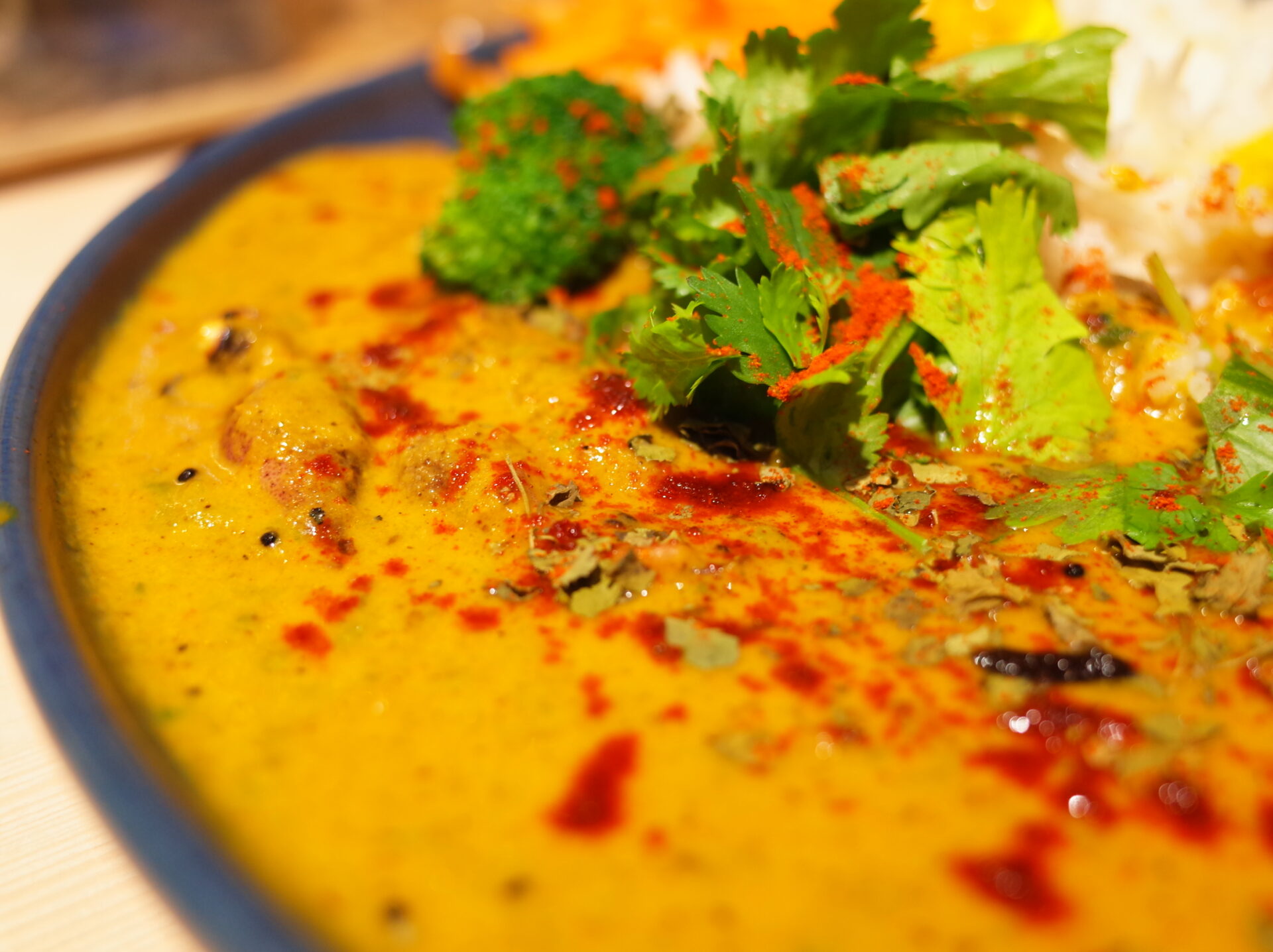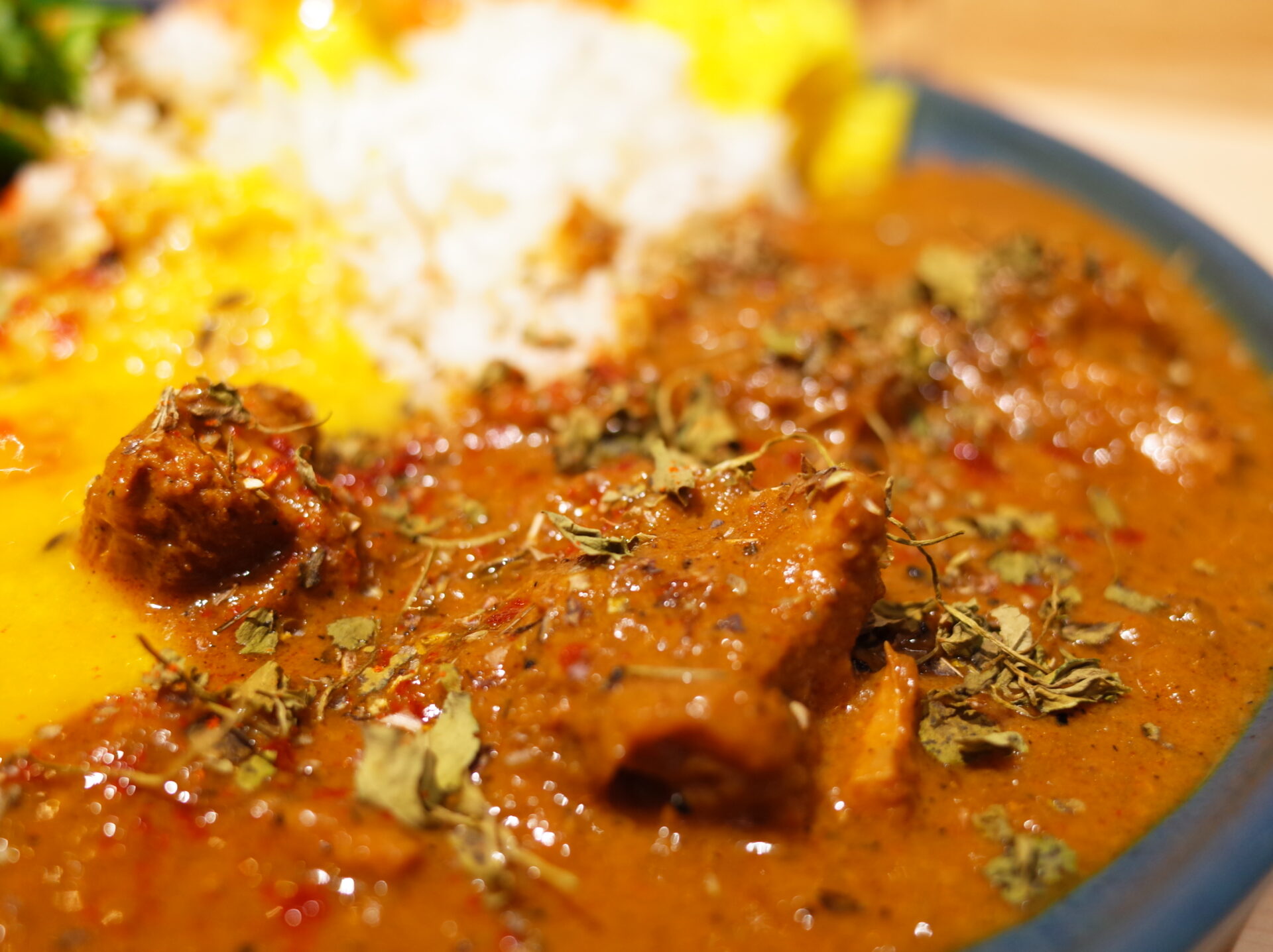 カルダモンチキンカレーはふわっと盛り付けられているカスリメティが良い香りを巻き上げていて、とってもスパイシーでガツンと来るグレービーにはカルダモンの爽やかで豊かな香りが舞っていました!