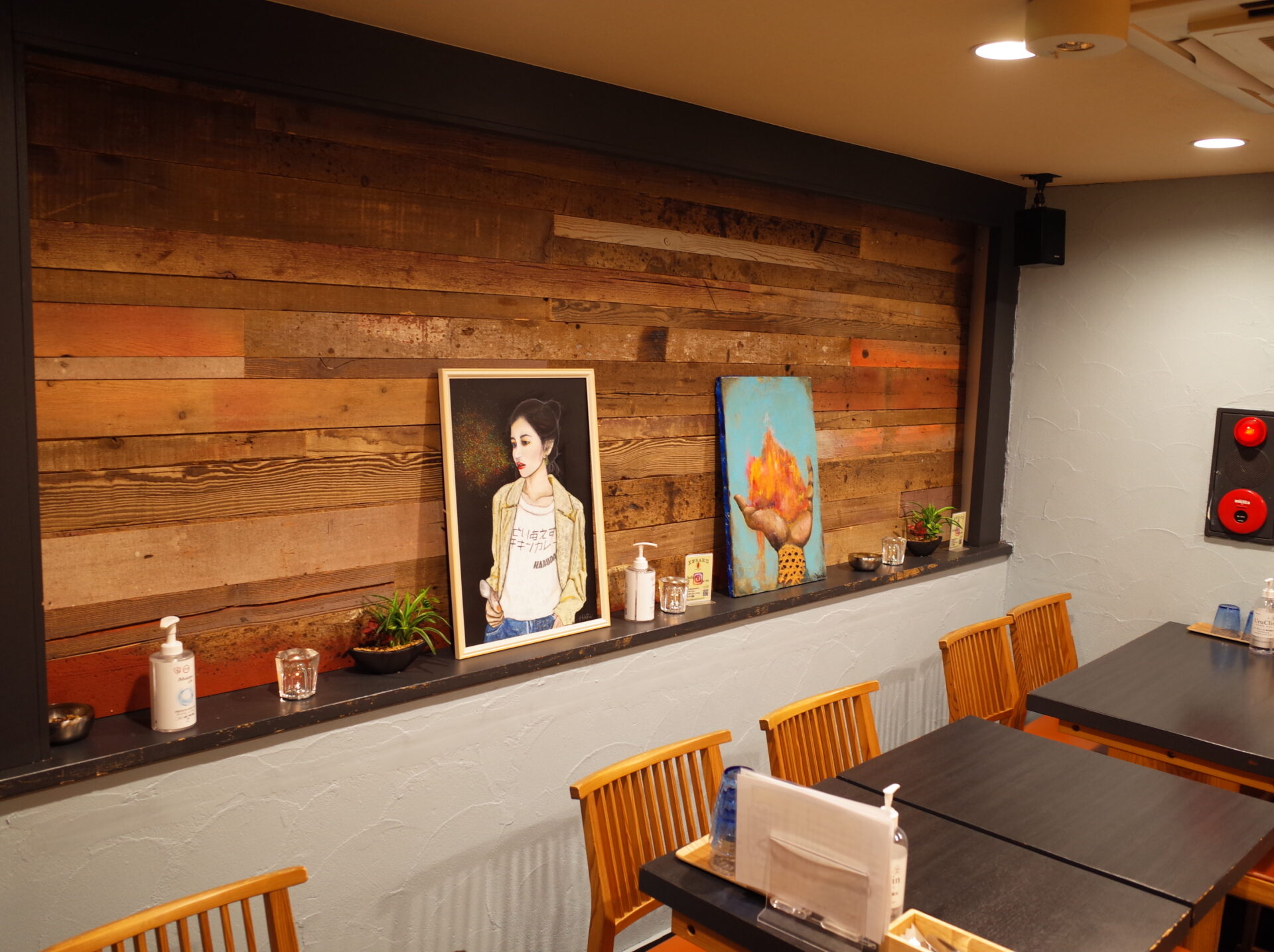 ケラクの店内は木の質感が素敵な壁にはアートが飾ってあります。監修をしているハルダモンのオーナーは絵描きさんなんですよ!「とりあえずチキンカレー」のTシャツほしかったです。かわいいですよね。ハルダモンにいくと、スタッフさんが着てます!