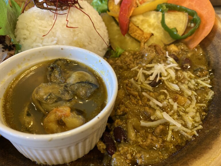ココットに入っているのが牡蠣と海老のスパイス炒め。牡蠣がたくさん入ってて(偶然?)食べてみると見た目とは違ってスパイシーで少し辛い。ただ極喱のカレーは全体的に基本は甘いので、ちょうどいいバランスで楽しめました。