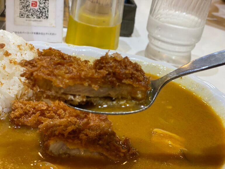 モンスナックのカツはいつもオーダーが入ってから揚げているので、外見はカリッとして中は熱くてカレーに浸しても冷めることはありません。お肉の方は薄すぎず、厚すぎずとスプーンでカレーと食べるにはちょうどいい大きさです。