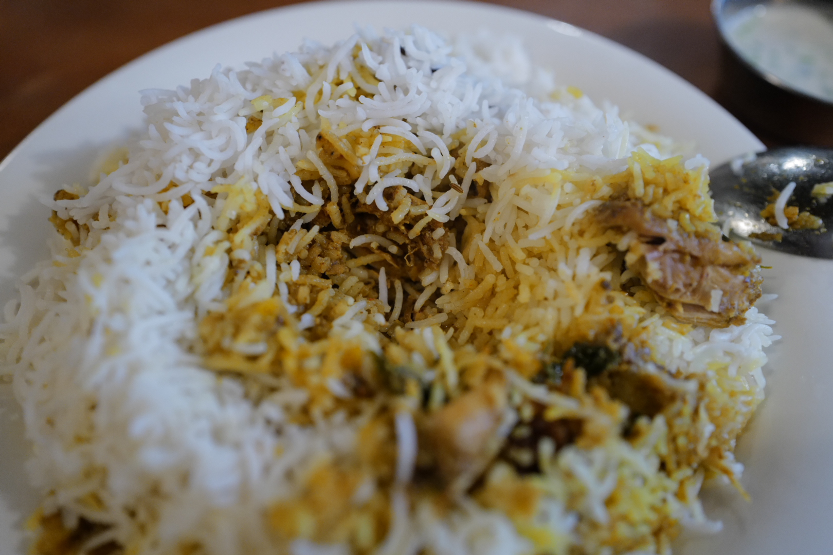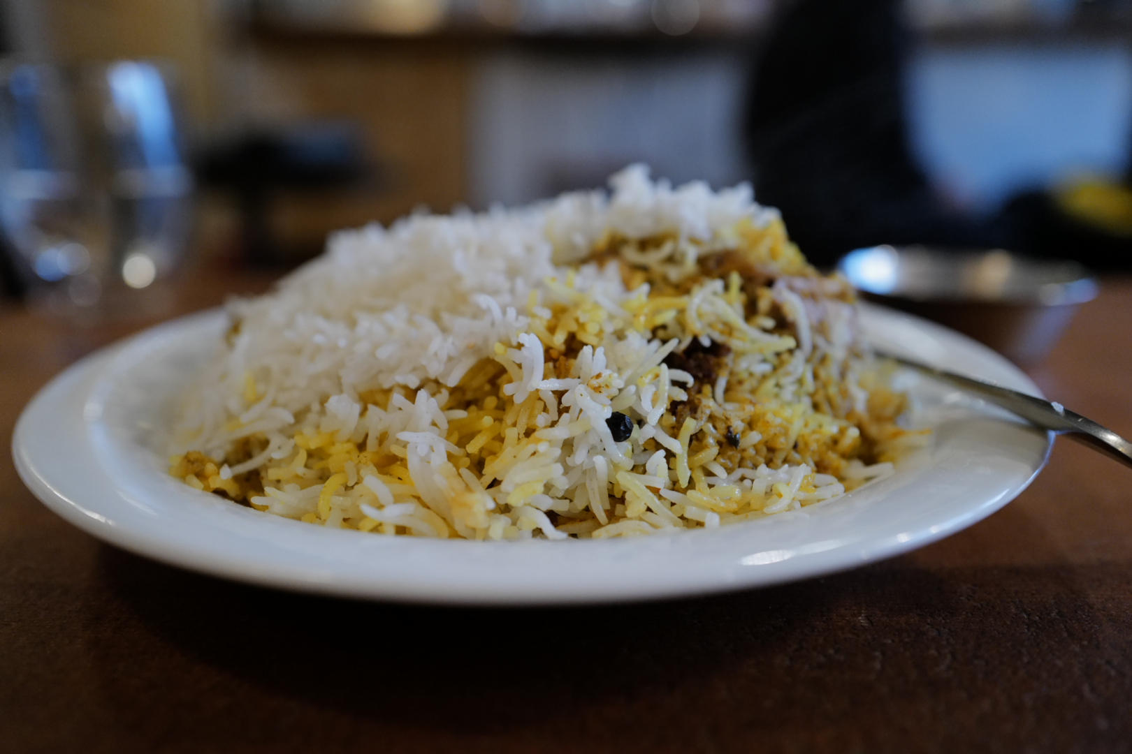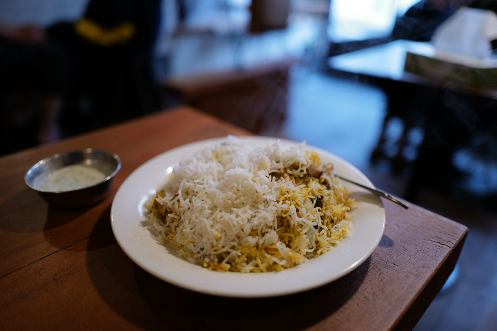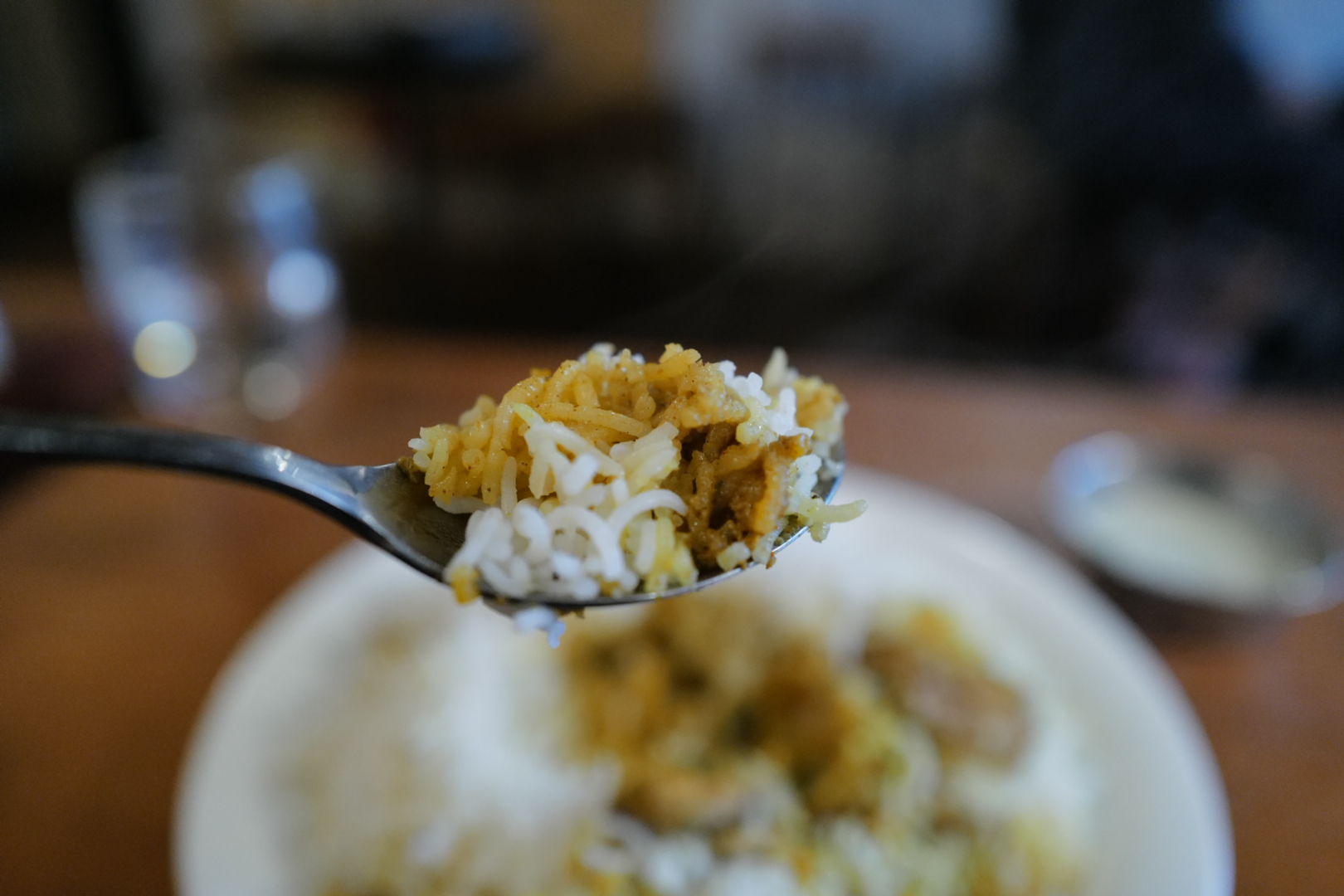 炊きあがったチキンビリヤニが運ばれてきます。音楽もない静かな店内は空気が澄んでいるような時間を演出し、炊きあがってすぐのビリヤニから舞い上がる湯気が店内の暗さに映えています。