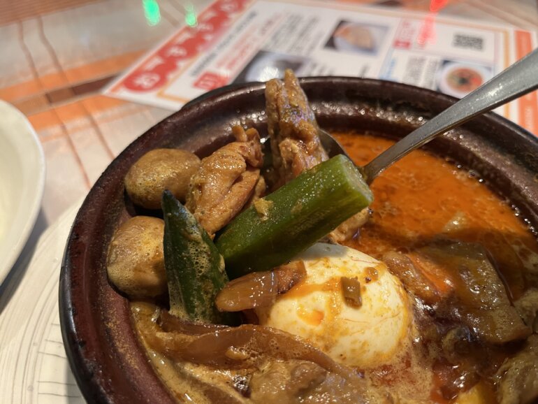 野菜は玉ねぎ、オクラ、にんじん、じゃがいも、そしてフクロ茸が入ってました!スープは辛口なんですが生クリオームが入ってて口当たりはまろやか。このクリーミーな辛口ソースがご飯にとても合います。そんなお客様の心を知っているのか、ご飯はおかわり無料でできるというサービス!