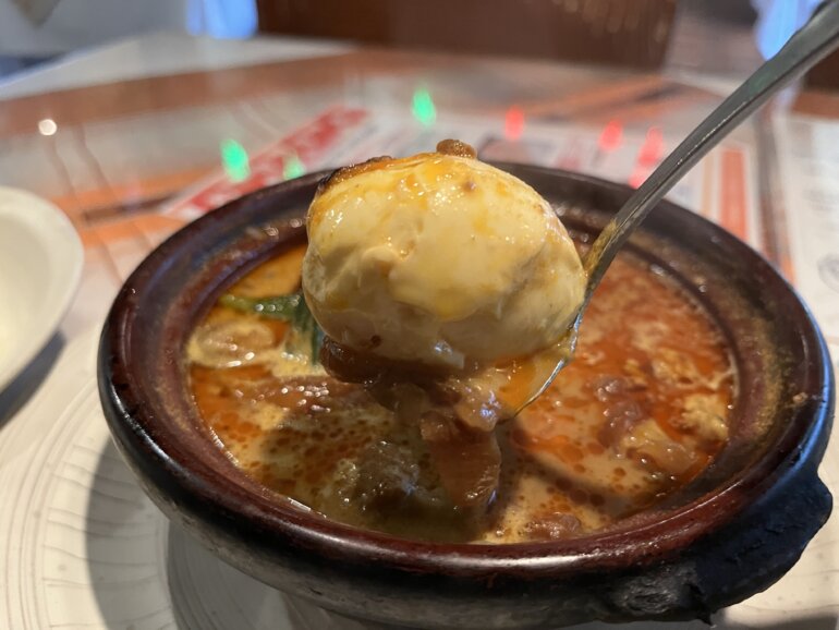 蓋がついたタジン鍋でテーブルまで持ってきてくれて、蓋をはずすとグツグツと煮立っていてとっても熱い!こんなカレーのスタイル今までにないし、レモンガラスのような香りもして、トムヤンクンのようなイメージ。って、不思議すぎる・・・マレーシア人のシェフがアレンジしているそうです。