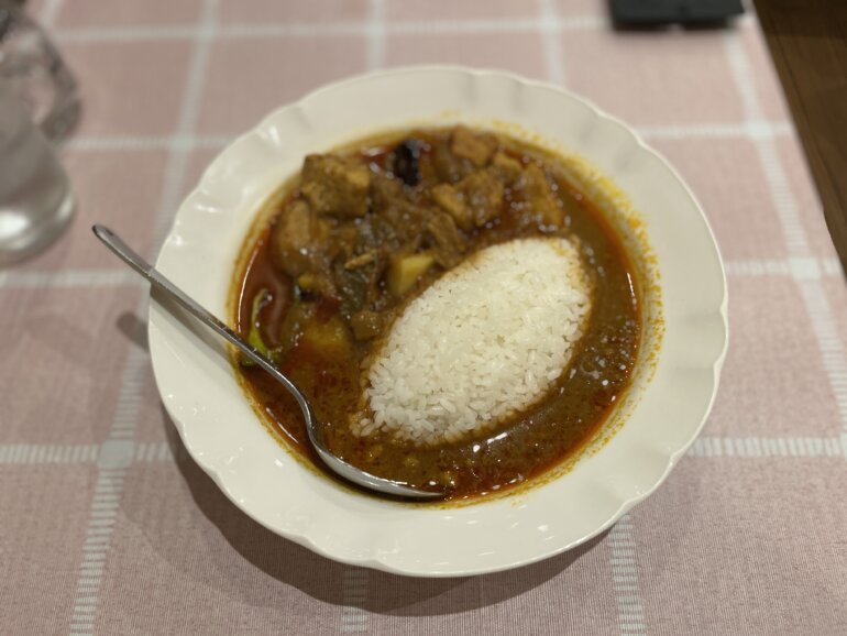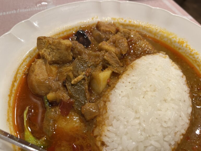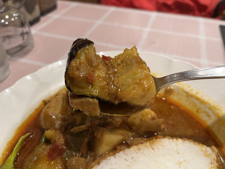 スープカレーのような見た目で早く食べてねと言わんばかりにどんどんとスープを吸水してしまいそなくらいご飯が埋もれています!そして思った以上の具だくさんでびっくり。一口食べてみると、むむ!意外と・・・思った以上に辛い。これは額から汗レベルです。だけどとってもおいしい!熱々で、辛いスープでとてもおいしい。ご飯が進みまくり・・ポークや、もはやどれも同化してしまっている野菜もおいしくて、具だけでもご飯食べられます。